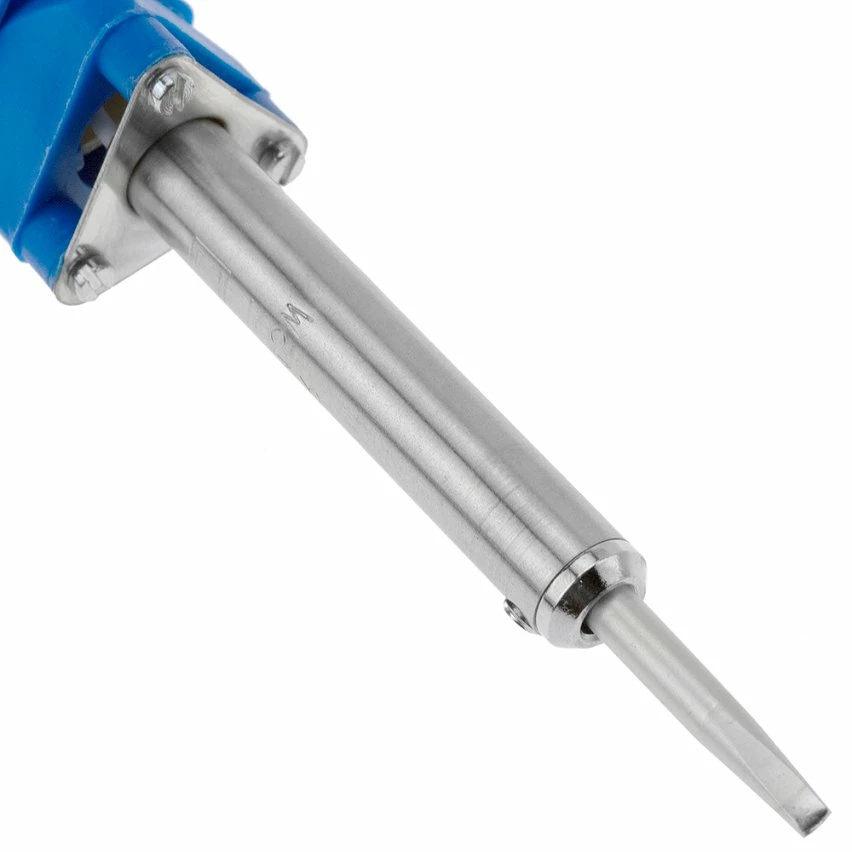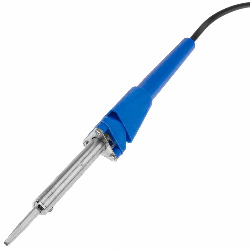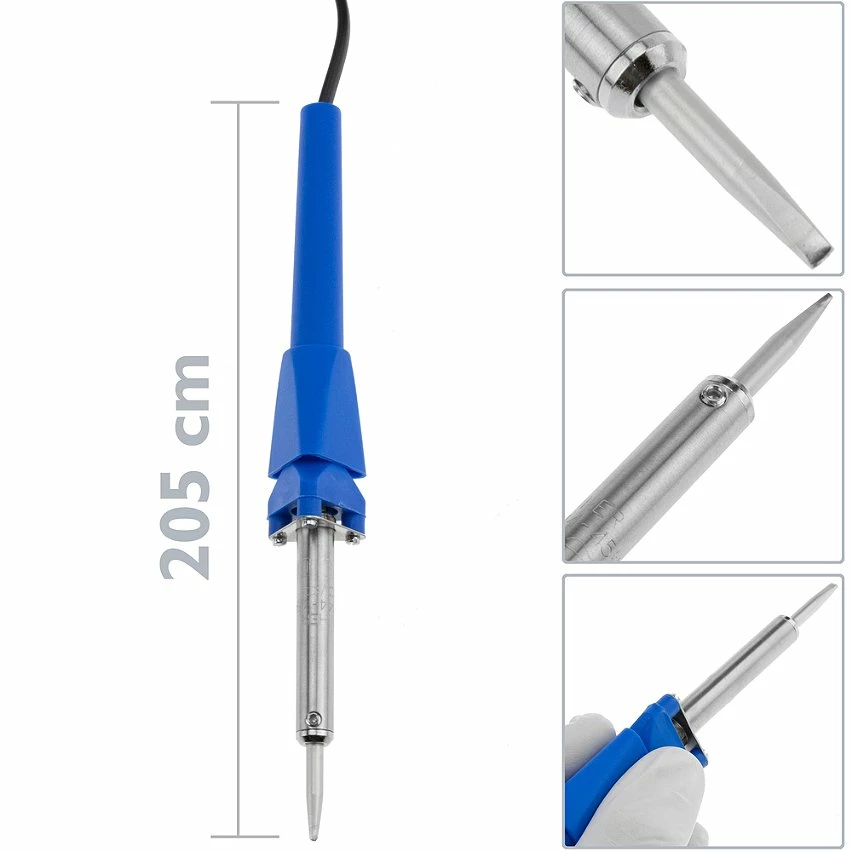 Fer à souder électrique à pointe interchangeable, transfère la chaleur à la pointe à l’aide d’une résistance électrique. Il a une poignée anti-thermique qui l’empêche de chauffer pour une longue utilisation. Idéal pour une utilisation dans des emplois dans le secteur du bricolage, la réparation d’appareils électroniques et la fabrication en série. Spécifications Fer à souder électrique à pointe interchangeable. Tension de fonctionnement: 230V 25W. Poignée résistante à la chaleur de couleur bleue. Léger, facile à manipuler. Monté avec un câble électrique de type bipolaire 220V de 1,7 mètre. Toutes ses pièces sont amovibles et interchangeables.