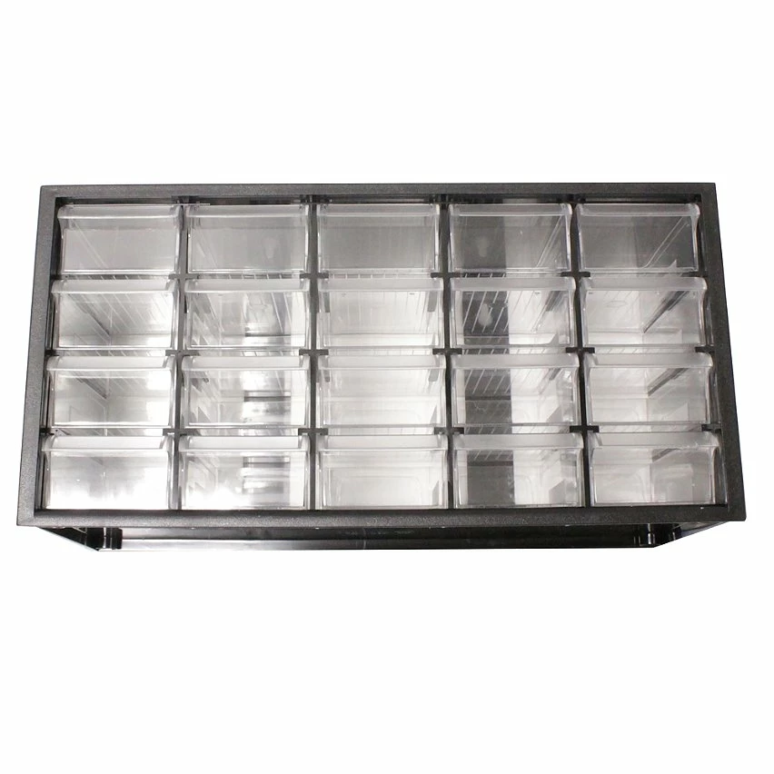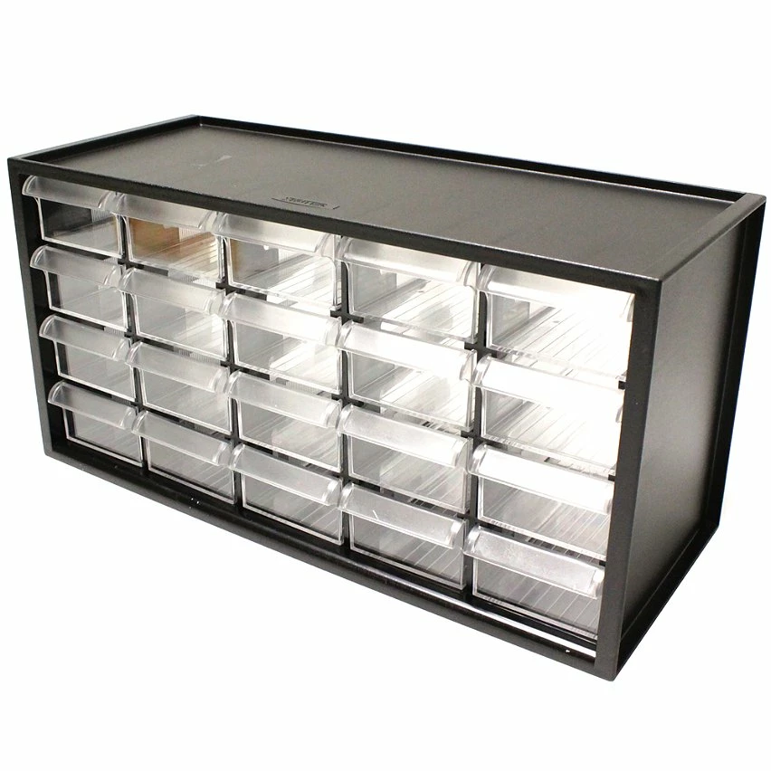 Système de rangement avec 20 tiroirs pour ranger de petits composants électroniques. Structure en plastique noir, où les tiroirs sont logés. 20 tiroirs en plastique transparent, pour voir le contenu de chaque tiroir. Taille totale: 379 x 151 x 200 mm. Taille d’un tiroir: 65 x 36 x 140 mm. Les tiroirs ont une poignée pour l’extraction. Des entretoises sont fournies pour diviser l’espace des tiroirs.