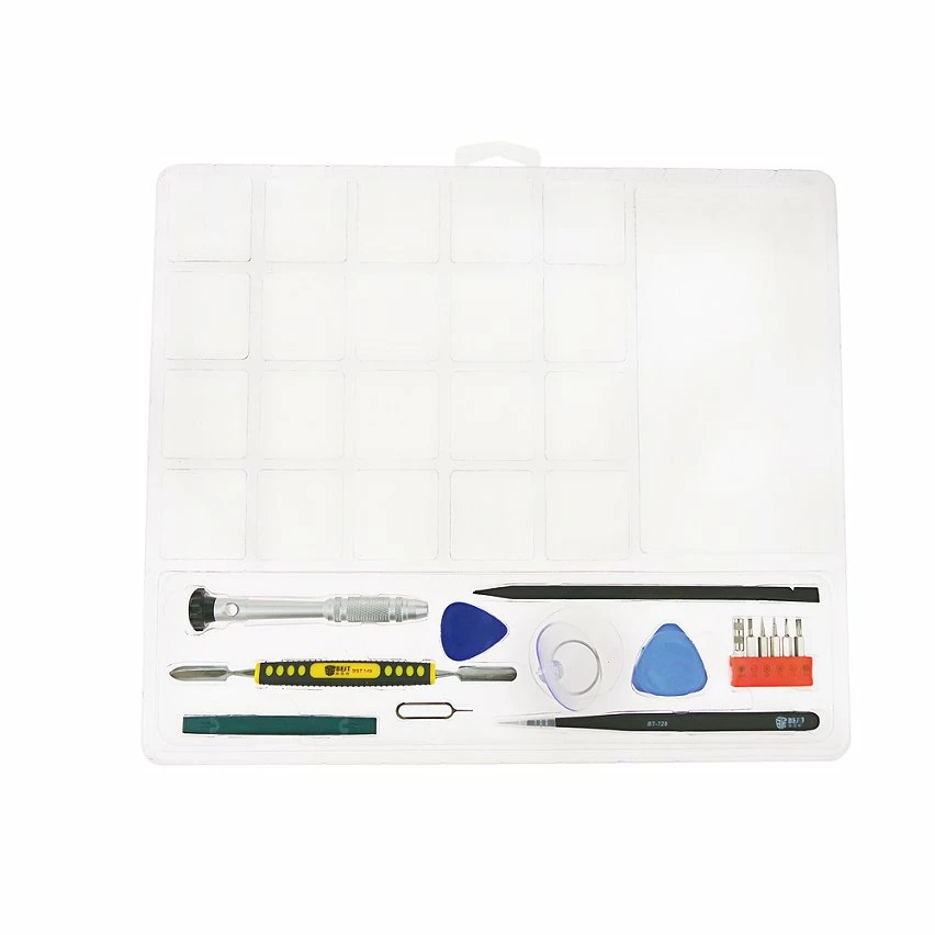 MEILLEUR kit d’outils de précision (modèle BST-932). Outils pour centres de réparation pour appareils électroniques et téléphones mobiles. Spécialement conçu pour réparer les petits appareils électroniques, les téléphones mobiles, les lecteurs MP3, etc. Compatible avec l’iPhone 4, l’iPhone 4S, l’iPhone 5, l’iPhone 5C, l’iPhone 5S, l’iPhone 6, l’iPhone 6 Plus et l’iPhone 6S. Comprend 3 leviers pour l’ouverture des boîtes, châssis et téléphants mobiles. 1 ventouse pour l’aspiration des couvercles, des plastiques et des cristaux. 1 clip droit de 140mm. 1 poinçon/levier de 150 mm. 1 broche à levier. 1 clip pour extraire la carte SIM compatible avec l’iPhone. 1 tournevis avec embouts interchangeables. 6 embouts de tournevis (hexagonal M2.5, plat 1.8, pentalobe 0.8, pentalobe 1.2, compatible avec Phillips 1.5, croix convexesfaire 2.5. 1 boîte pour séparer les petites parties de l’appareil à réparer.