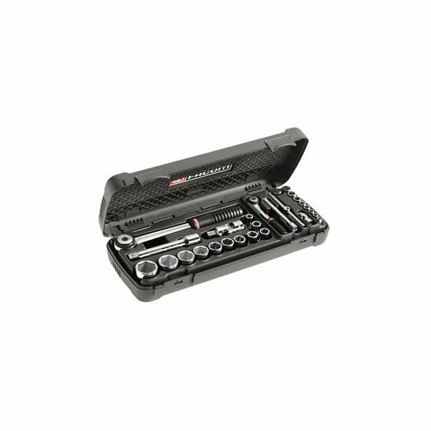 Du cliquet 1/4″ « paume de main » aux douilles 6 pans en passant par le cardan universel ou encore la poignée coulissante 1/4, ce coffret mixte Facom ne manque de rien. Equipé d’un mécanisme 72 dents, le cliquet réversible 1/4″ + 1/2″ propose un système « paume de main » qui permet d’appuyer sur la tête du cliquet pendant le (des)serrage, sans risque d’inversion accidentelle du sens de rotation tout en proposant une reprise à 5° !