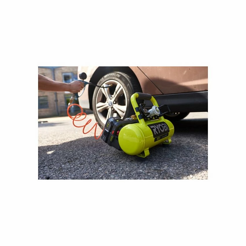 Le compresseur à cuve RYOBI 18V One Plus – 4L- Sans batterie ni chargeur R18AC-0, vous permettra de gonfler vos pneus mais aussi vous pourrez l’associer aux cloueur et agrafeuse pneumatiques.
