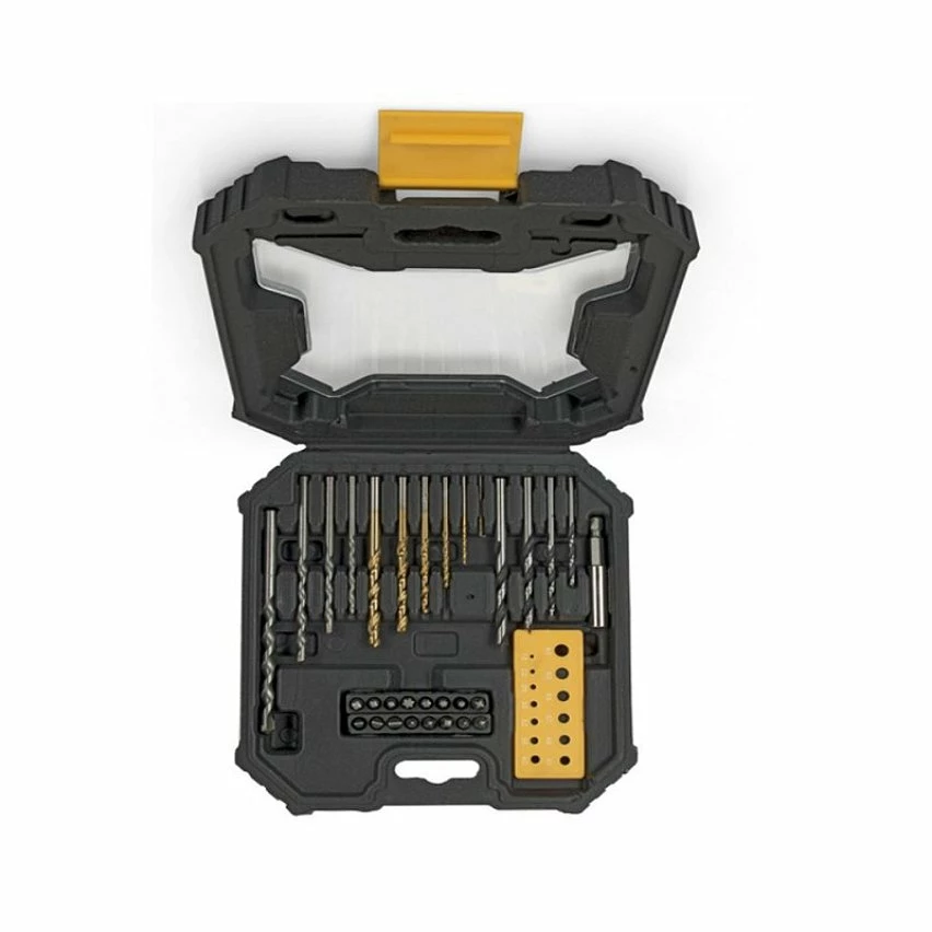 Cette mallette contient : 6 forets HSS; 4 forets pour pierre; 4 forets pour bois; 1 mesureur de forets; un support magnétique et 16 embouts