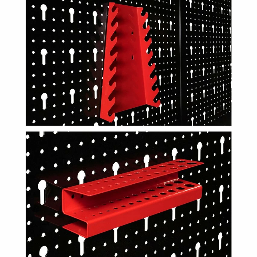 Descriptif du panneau mural perforé en acierOptimisez le rangement de votre atelier ou de votre garage avec le panneau mural perforé. Très simple à installer, il vous permet de stocker vos outils et de gagner de la place en un clin d’œil ! Fabriqué en acier et recouvert d’une peinture noire électrostatique, le panneau est composé de 3 parties de 40 cm x 60 cm chaque. Son épaisseur de 0.8 mm confirme sa robustesse. Le trio de panneaux perforés est livré avec de multiples accessoires afin de vous faciliter le rangement et le stockage de vos outils. Les 4 longs et 4 petits crochets en acier galvanisé ainsi que 9 crochets spéciaux rouges deviendront vos indispensables ! Pratique, le panneau perforé représente un réel gain de temps pour vous : ne cherchez plus dans les boîtes ou tiroirs ce dont vous avez besoin ; il vous suffit de choisir directement vos outils bien exposés sur le mur et de toujours les avoir à portée de main. Dimensions du panneau mural perforé en acier- Dimensions totales : Longueur 120 cm x Hauteur 60 cm- Dimensions d’un panneau : Longueur 40 cm x Hauteur 60 cm- Épaisseur du panneau : 0.8 mm- Matériaux : acier pour le panneau et acier galvanisé pour les crochets- Livré avec 17 accessoiresBesoin de ranger également vos vis ou autre quincaillerie ? Découvrez notre kit de rangement mural avec supports et casiers disponible sur notre boutique en ligne !
