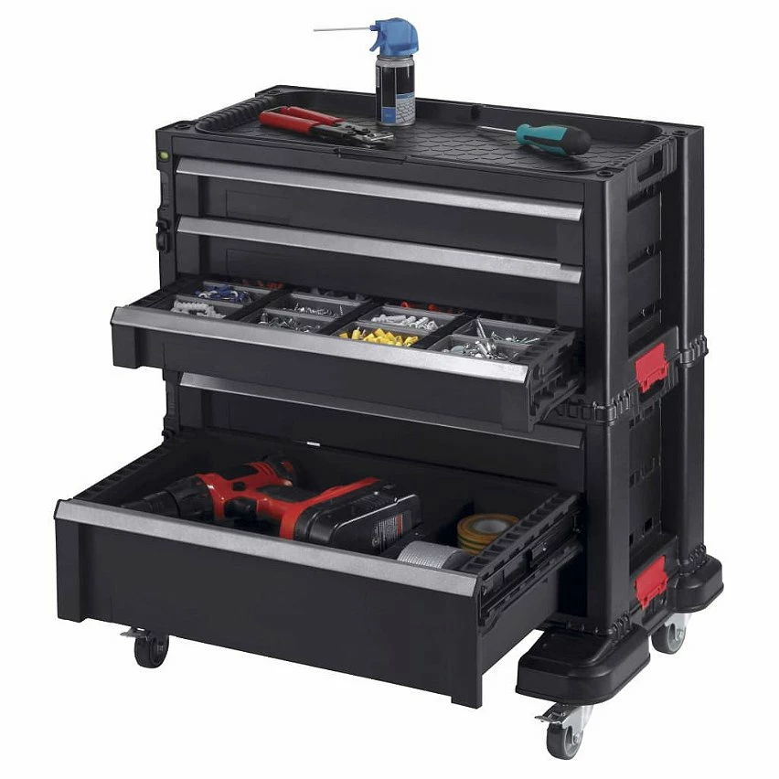 Les tiroirs peuvent être complètement retirés et coulissent sur des glissières robustes à roulement à billes en métal. Quatre tiroirs étroits avec des plateaux amovibles sont adaptés à l’organisation de petites pièces, tandis qu’un tiroir profond a un séparateur amovible. Mobile et polyvalent, ce coffre est équipé de roulettes pour que vous puissiez le déplacer facilement au besoin. De plus, le mécanisme de verrouillage et de fermeture facilite l’empilement d’autres unités de l’assortiment.