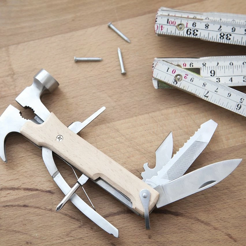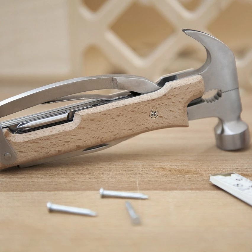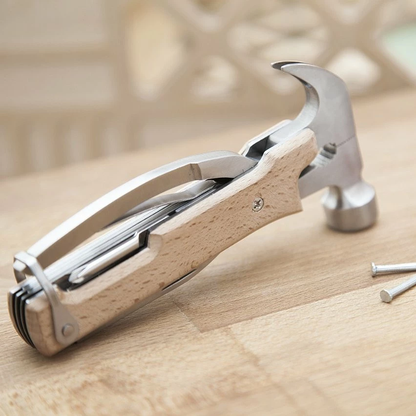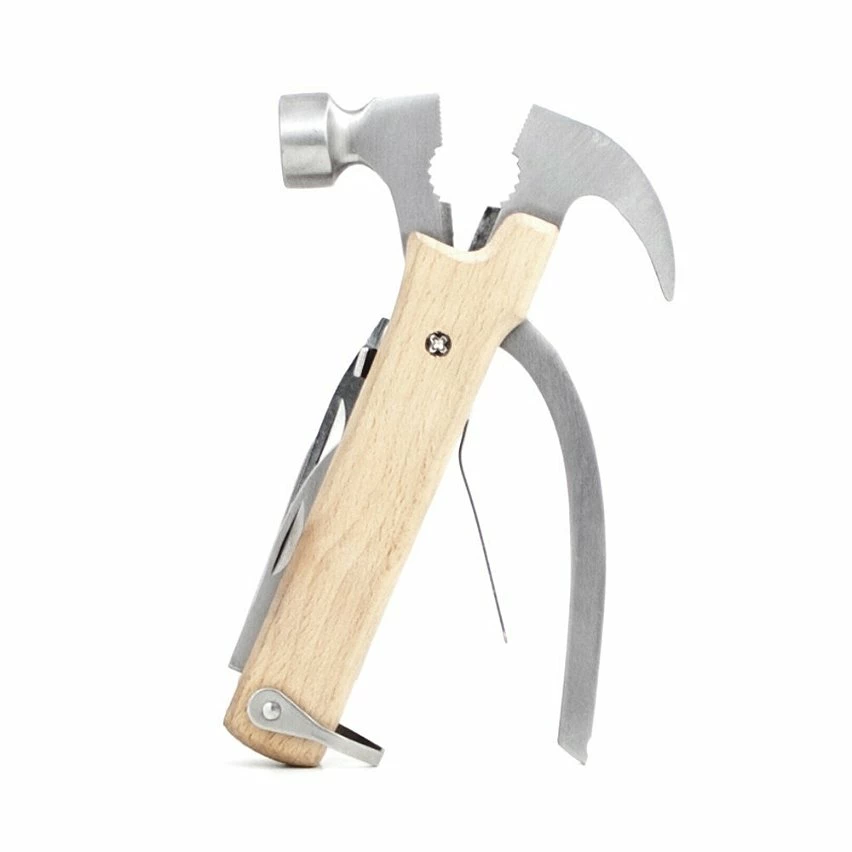Ce marteau outil 10 en 1 vous surprendra par toutes ses fonctions : Coupe-fil, marteau, tournevis plat, décapsuleur, presse-citron, lame-scie, pince, tournevis cruciforme, couteau. Dimensions fermé : 14 x 7.5 x 2.4cm Matières : bois et inox