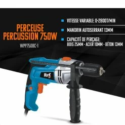 - Perçage Acier : 13 mm / Béton : 22mm / Bois: 28mm