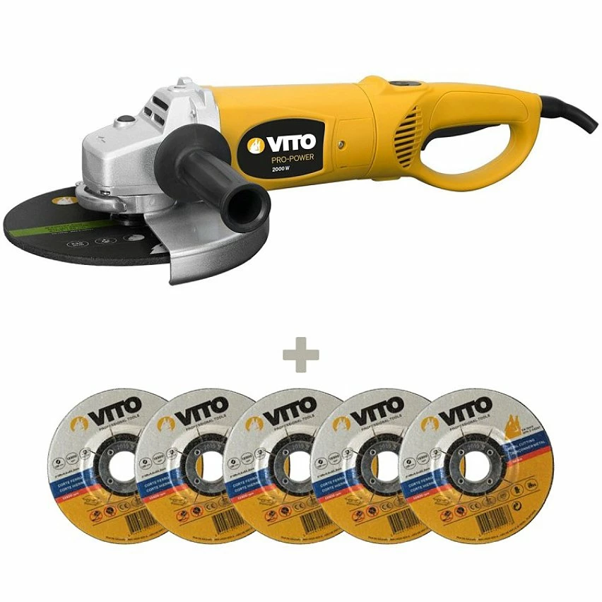 La meuleuse VIRE23020 de VITO délivre une puissance de 2000W. Pour disque de 230mm. Système de protection et de frein pour le disque. Elle possède une boîte d’engrenage en acier. La vitesse de rotation est de 6200 tour/min. Livrée avec DISQUE DIAMANT, clé et jeu de charbon. Livré avec 5 disques à tronçonner diamètre 230 MM