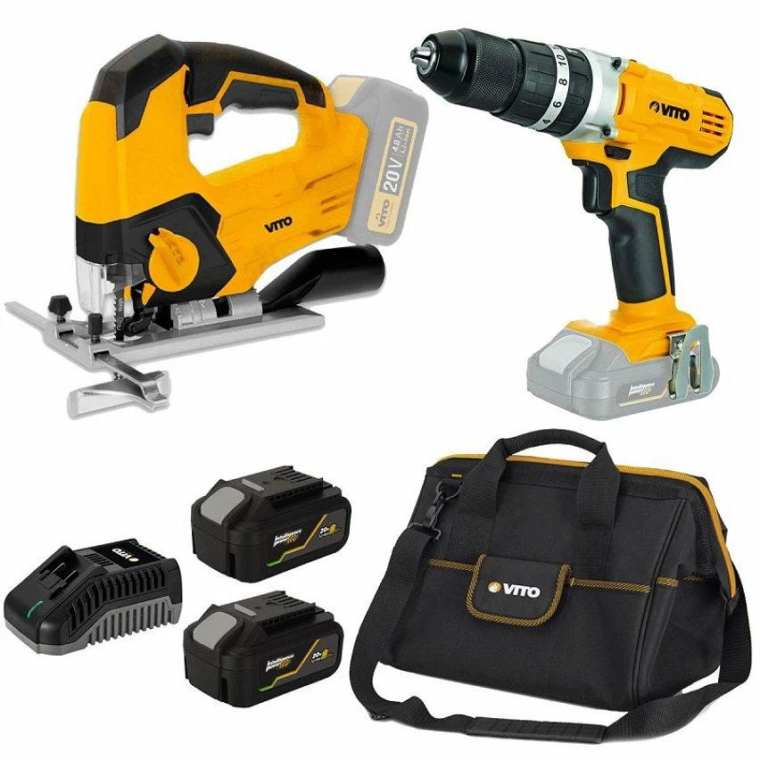 Pack 2 outils complet VITO de la gamme à batterie 20 V VITO EGO composé d’une scie sauteuse et d’une perceuse/visseuse. Ce pack vous est livré avec deux batteries au lithium de 4 Ah, un chargeur rapide et une sacoche pour ranger vos outils.