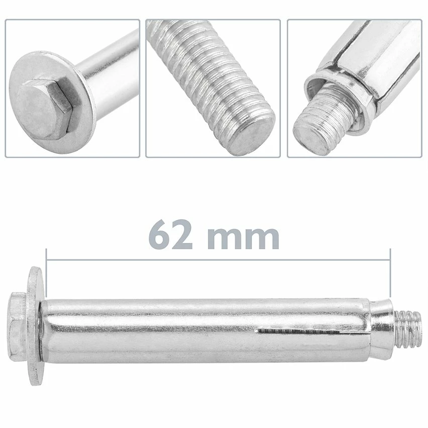 Système de fixation spécial pour charges élevées. Recommandé pour des utilisations telles que la pierre naturelle, le béton, les murs solides. L’expansion est créée en serrant le boulon fileté à l’aide d’une clé dynamométrique qui attire un cône conique en étendant un manchon contre les parois du trou. Valable pour les installations de clôtures, portes antivol, ralentisseurs, systèmes de fixation de climatisation, etc. spécifications Vis d’expansion M8 de couleur argent. Boulons expansifs à haute résistance, pour une utilisation à l’intérieur et à l’extérieur. Recommandé pour une utilisation sur la pierre naturelle, le béton et les murs pleins. L’expansion est créée en serrant le boulon fileté à l’aide d’une clé dynamométrique qui attire un cône conique en étendant un manchon contre les parois du trou. Dimensions de chaque boulon: 12 x 12 x 62 mm (largeur x hauteur x profondeur).
