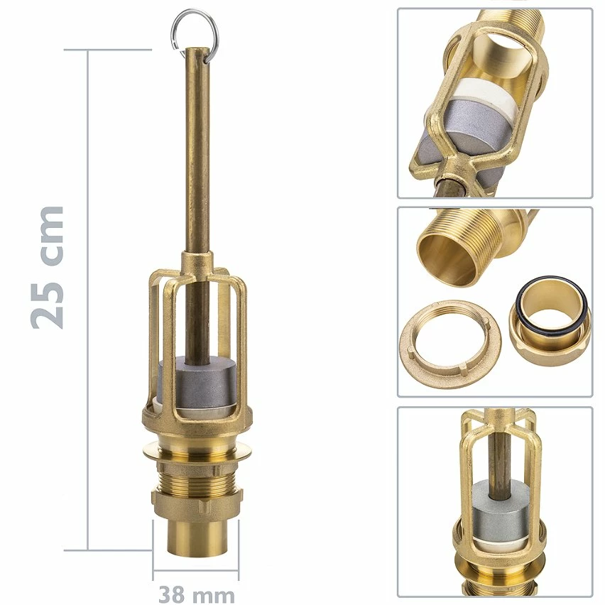 Mécanismes de chasse universels pour citernes, qui garantissent le fonctionnement optimal des toilettes. Ses matériaux de construction durables et inoxydables permettent au système de fonctionner parfaitement pendant longtemps. Montage simple car il ne nécessite pas de démontage du réservoir pour l’installation. Idéal pour remplacer l’ancien mécanisme défectueux. spécifications Déchargeur d’eau manuel pour réservoir WC. Mécanisme de décharge en laiton et plomb pour une durabilité maximale. Il dispose d’un système de rétention avec un poids en plomb, ce qui permet d’obtenir une étanchéité totale de l’eau dans la citerne. Uniquement compatible avec les réservoirs hauts. Installation facile par filetage de 38 mm de diamètre.