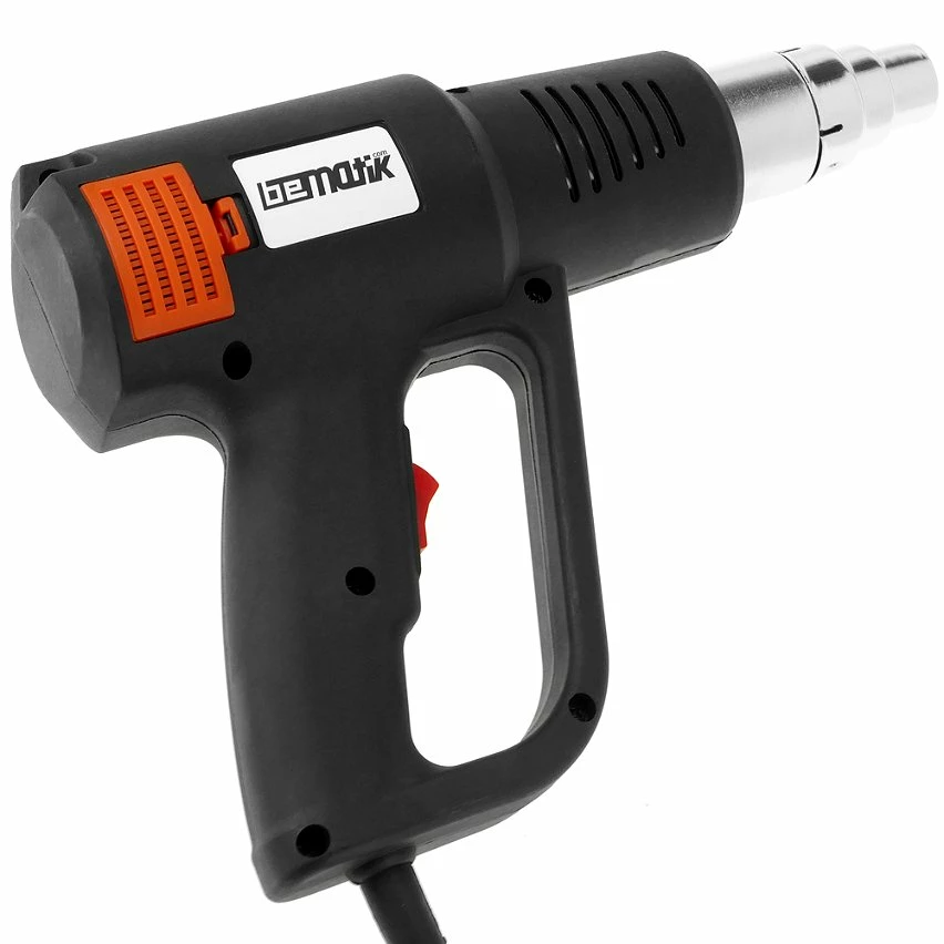 Pistolet à air chaud professionnel. Décapant thermique à usage professionnel ou pistolet thermique pour différentes tâches de bricolage. Idéal pour une utilisation dans le moulage, le soudage, le rétrécissement ou pour enlever des couches de peinture, de rouille ou de vernis, entre autres utilités et en fonction de la température de travail. Caractéristiques Pistolet à air chaud professionnel 2000W. Il permet la sélection du débit d’air en deux phases: Phase I 200 l / min ou Phase II 500 l / min. Il fonctionne à 300 ° C ou 600 ° C. Comprend une buse ronde de 3,5 mm de diamètre et un adaptateur pour buse de 2 mm de diamètre. Compatible avec nos gammes de gaines thermorétractables # FN3x, # F4x, # FN5x, # FN6x, # FN7x, # FN8x, # FN9x, # HA0x et # HA2x.