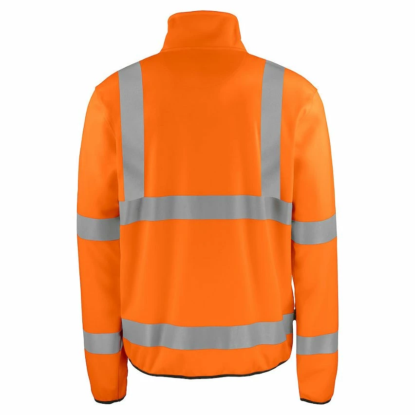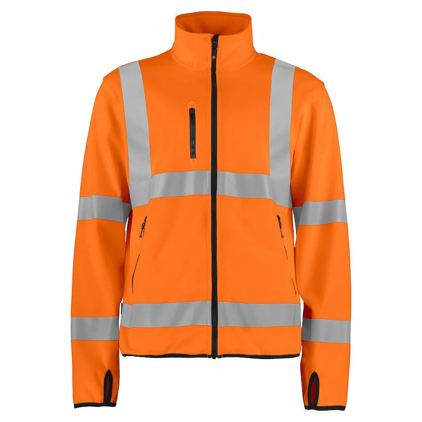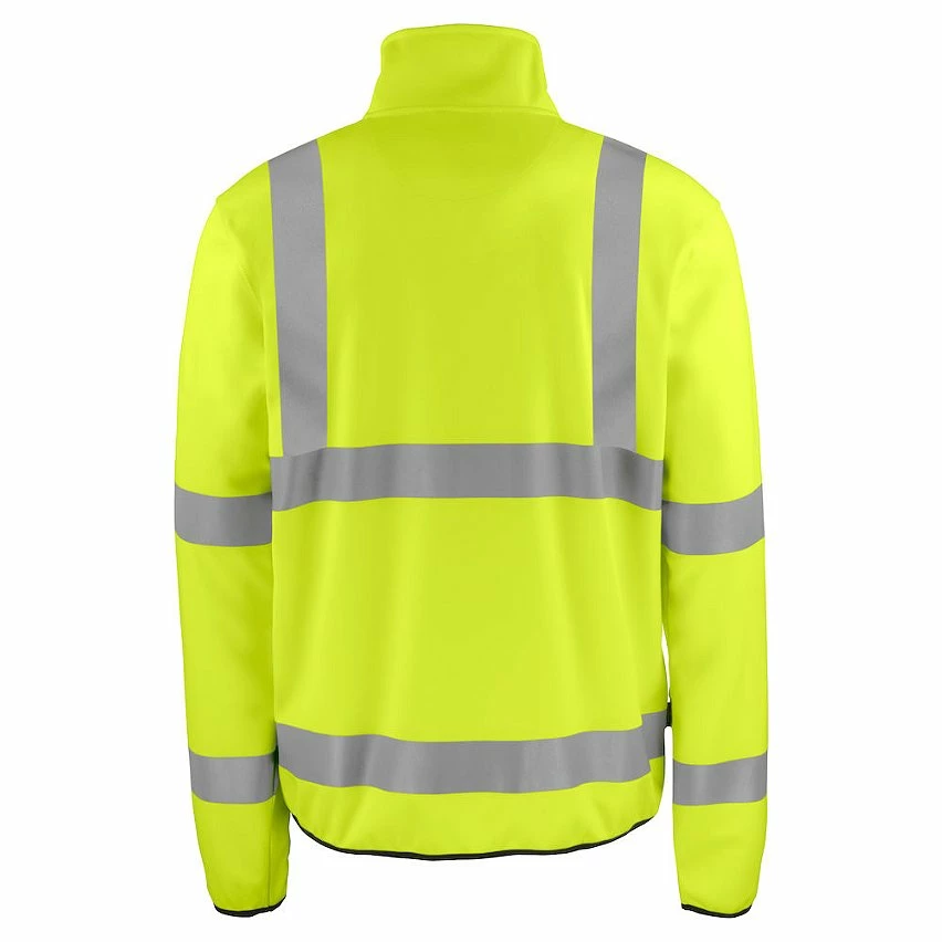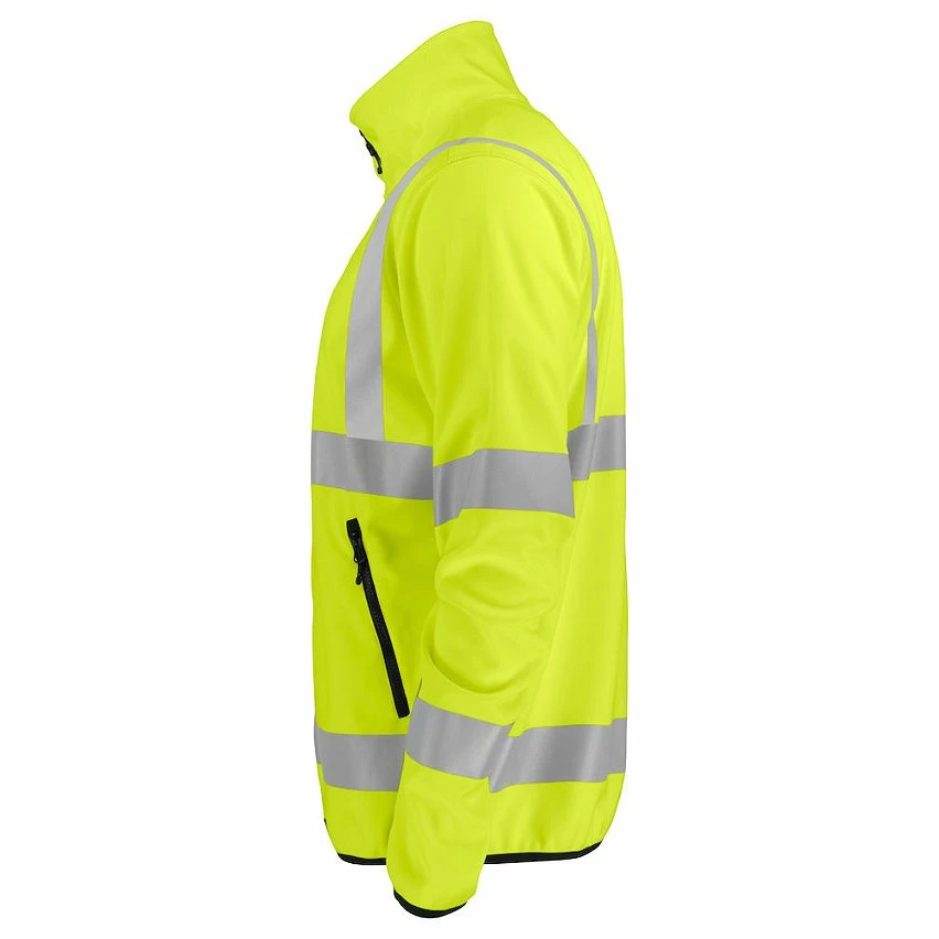 Veste softshell Homme full zip – 2 couches – Déperlante – Zip central YKK contrasté + rabat coupe-vent intérieur – Poche poitrine zippée – 2 poches latérales zippées – Passe-pouce – Bandes élastiques à la taille et aux poignets – Bandes HV thermocollées – EN ISO 20471 Classe 3