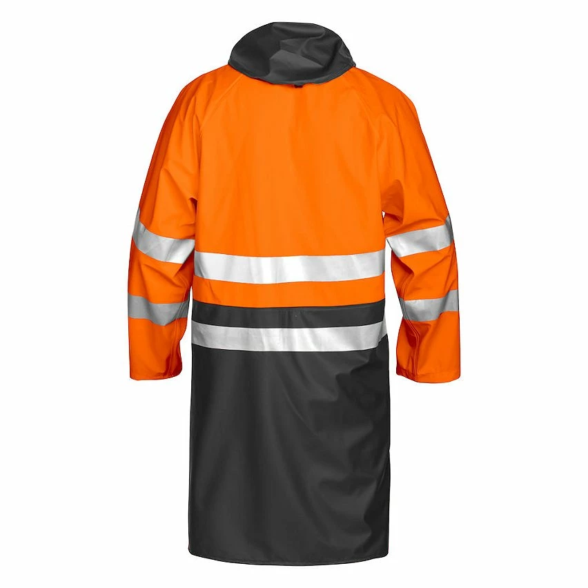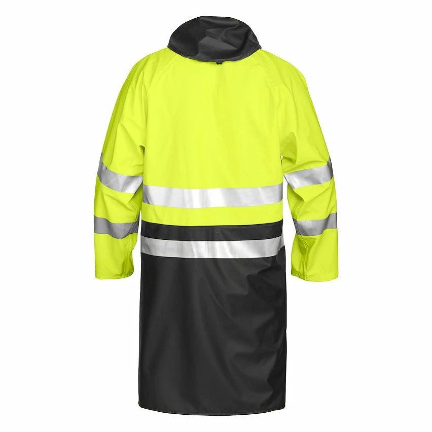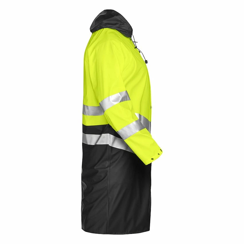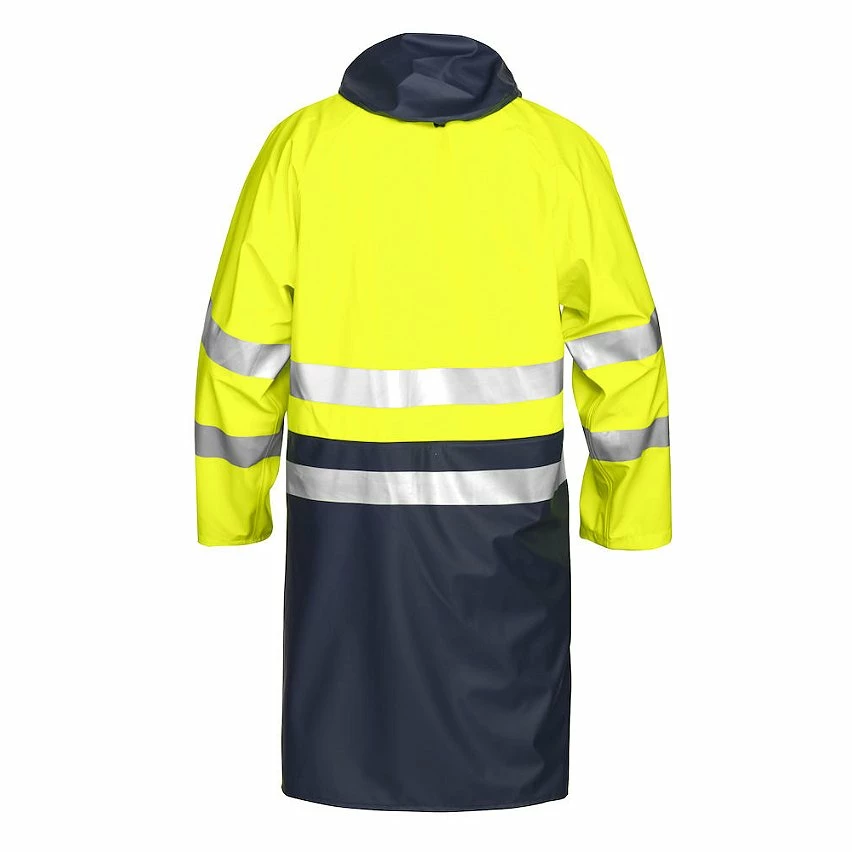 Veste de pluie Homme – Coutures thermo-soudées – Imperméabilité : 3000 gr/m2/24h – Longueur 100 cm – Capuche + poignets ajustables – EN ISO 20471 Classe 3