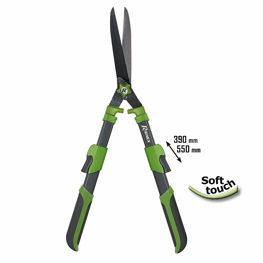 Lame et contre-lame 200 mm ép. 4 mm en acier au carbone #50 trempé. Lame avec revêtement antirouille. Bouton de réglage de pression des lames. Butées d’amortissement de coupe. Manches télescopiques de 390 à 550 mm en acier peint époxy. Déblocage et blocage par rotation 1/4 tour. Poignées en mousse antiglisse.