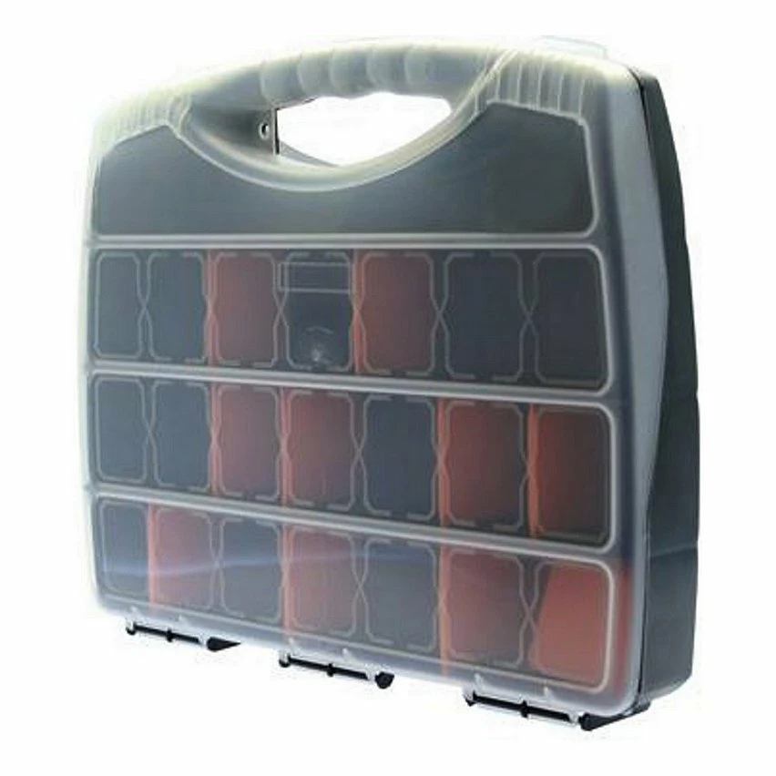 Casier a vis 23 compartiments amovibles 2 larges attaches pour éviter les ouvertures intempestives en cas de chute. Idéal pour le bricolage , la pêche Dimensions : 32 x 27 x 7 cm