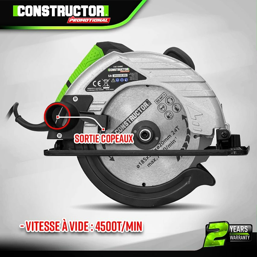 Cette scie circulaire de la marque Constructor promotional est idéale pour les coupes droites ou inclinées dans le bois.