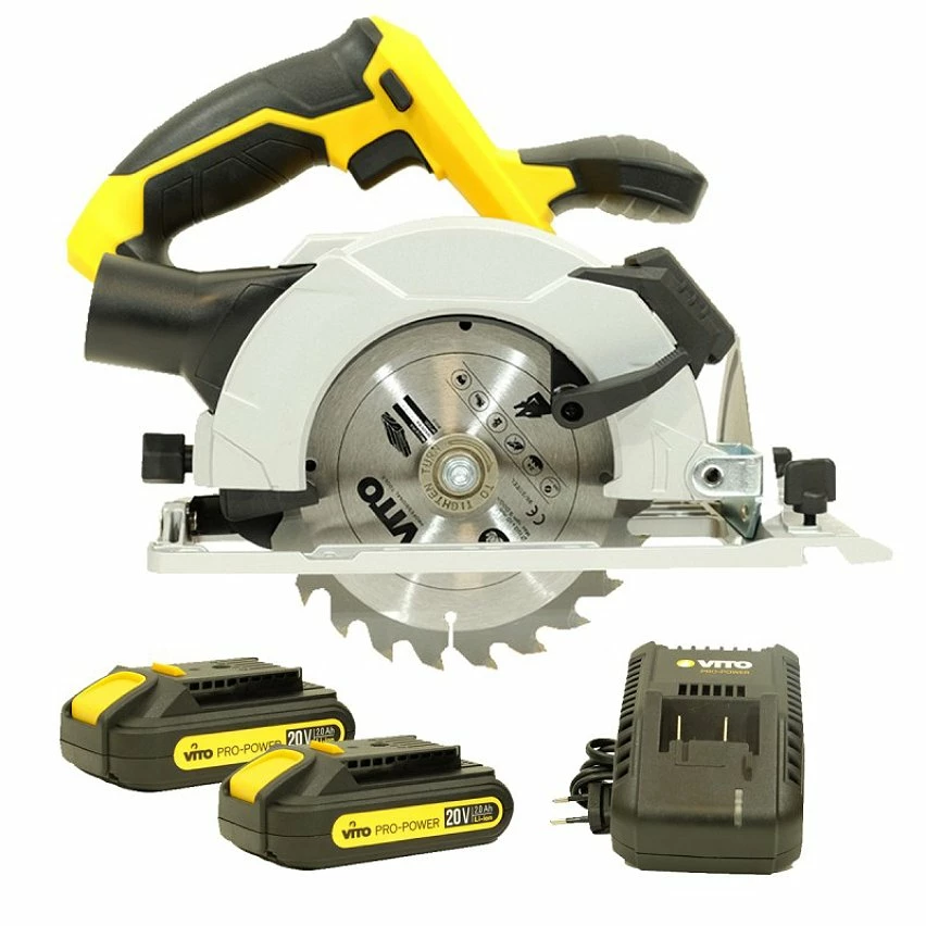 Scie circulaire sans fil VITOPOWER 20 V équipée d’un disque de 150 mm de diamètre. Vitesse de 4200 tours/minute. Possède un réglage d’inclinaison jusqu’à 90º et son corps est en aluminium.
