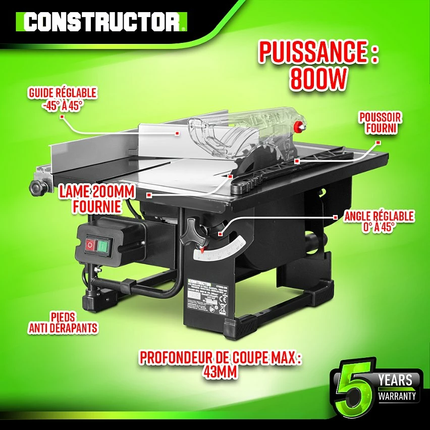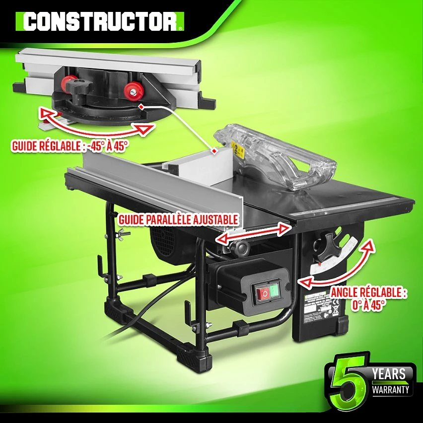 Compact et puissante, cette scie circulaire sur table de la marque Constructor vous permettra de faire des découpes droites ou en biais (0 0 45°) dans du MDF, du bois massif, des panneaux…