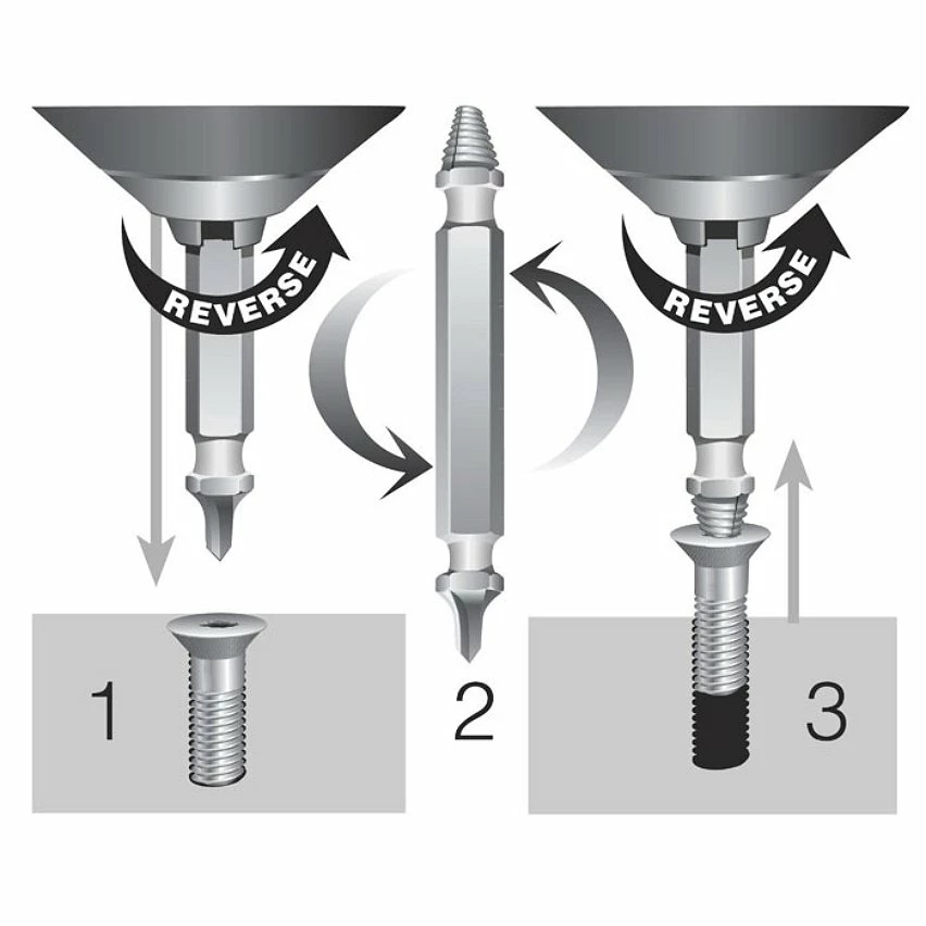 Chaque foret à double action perce la tête des vis pour ensuite les extraire sans effort.