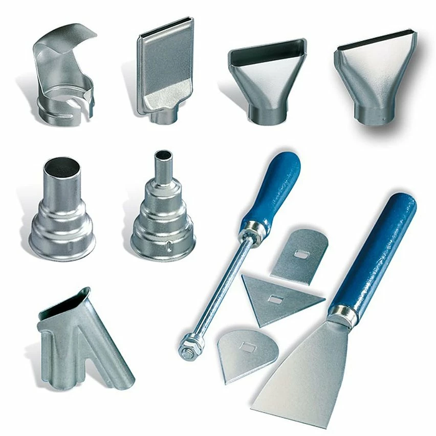 L’ensemble comprend une buse de surface de 75 mm, une buse de fenêtre de 75 mm, une buse de réduction de 14 mm, une buse de réduction de 9 mm, une buse à large fente, une buse de soudage, une buse de réflecteur de 24 mm, un grattoir et un porte-lame à 3 lames. L’ensemble d’accessoires à air chaud est adapté aux pistolets à air chaud HG 2120 E, HG 2320 E, HG 2220 E, HG 2000 E, HG 2300 E, HG 2310 LCD.