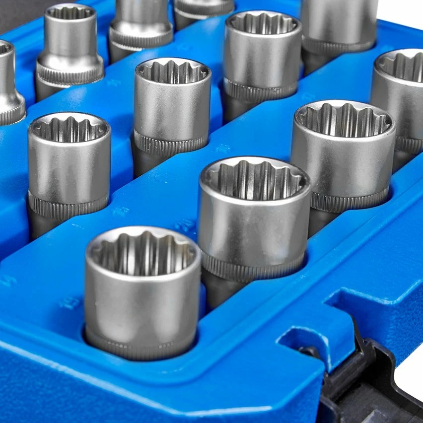 - 16 Clés à douille femelle ½ pouce avec 12 pans (E8, E9, E10, E11, E12, E13, E14, E15, E16, E17, E18, E19, E20, E21, E22, E24).