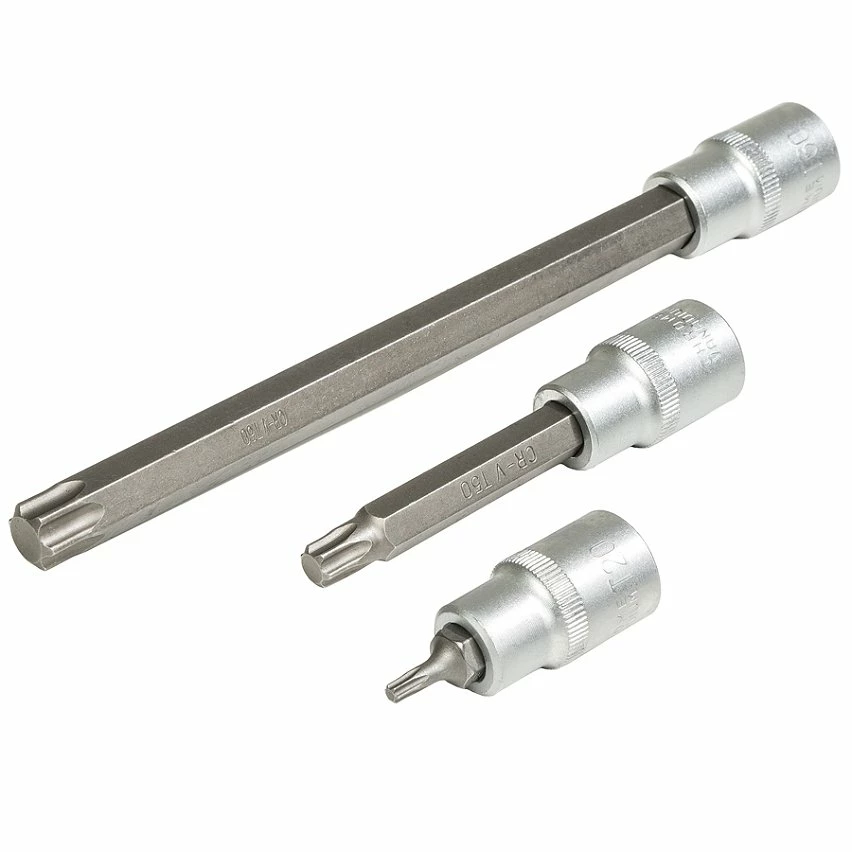 - 10 Douilles de 100 mm de longueur, dans les tailles T20, T25, T27, T30, T40, T45, T50, T55, T60 et T70.