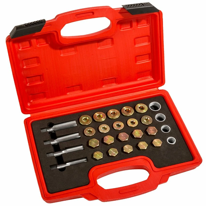 - Matériaux : Joints d’étanchéité en Aluminium. / Tarauds en Acier de qualité. / Bouchons de vidange en Acier Carbone. / Mallette en Plastique.