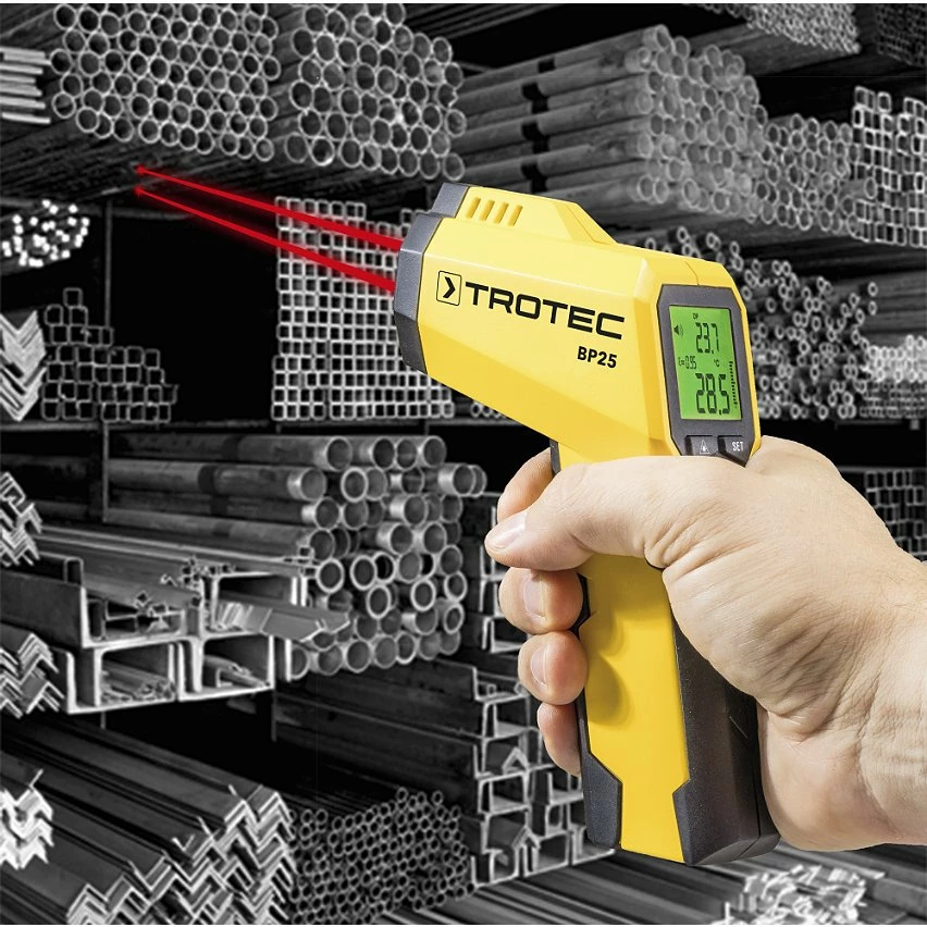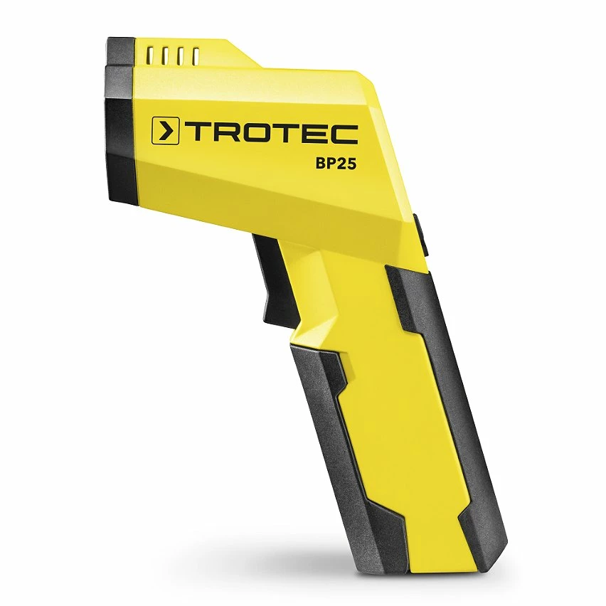 Le pyromètre infrarouge BP25 mesure la température de surface de murs, de matériaux et d’objets sans contact. Afin que vous puissiez visualiser la surface que vous mesurez (la zone de visée), le BP25 dispose d’un double viseur laser. Ce viseur projette deux points laser représentant le diamètre de la surface à mesurer. La température est captée par un capteur infrarouge et l’appareil détermine une moyenne. Plus la zone de visée est réduite, plus la mesure sera précise ; le diamètre de la zone de mesure grandit proportionnellement à la distance à l’objet. Grâce à sa résolution spatiale de 20:1, cet appareil portable offre une haute précision même à quelques mètres de l’objet à mesurer.