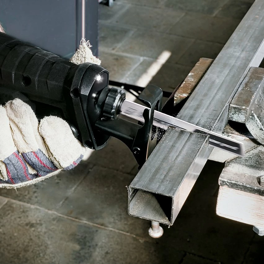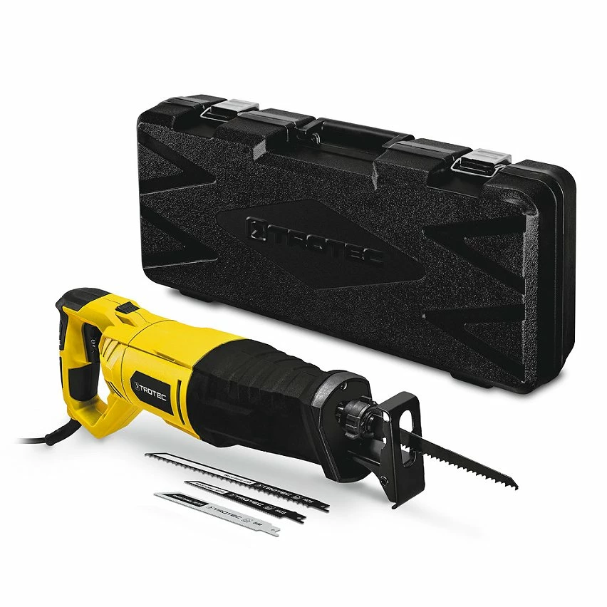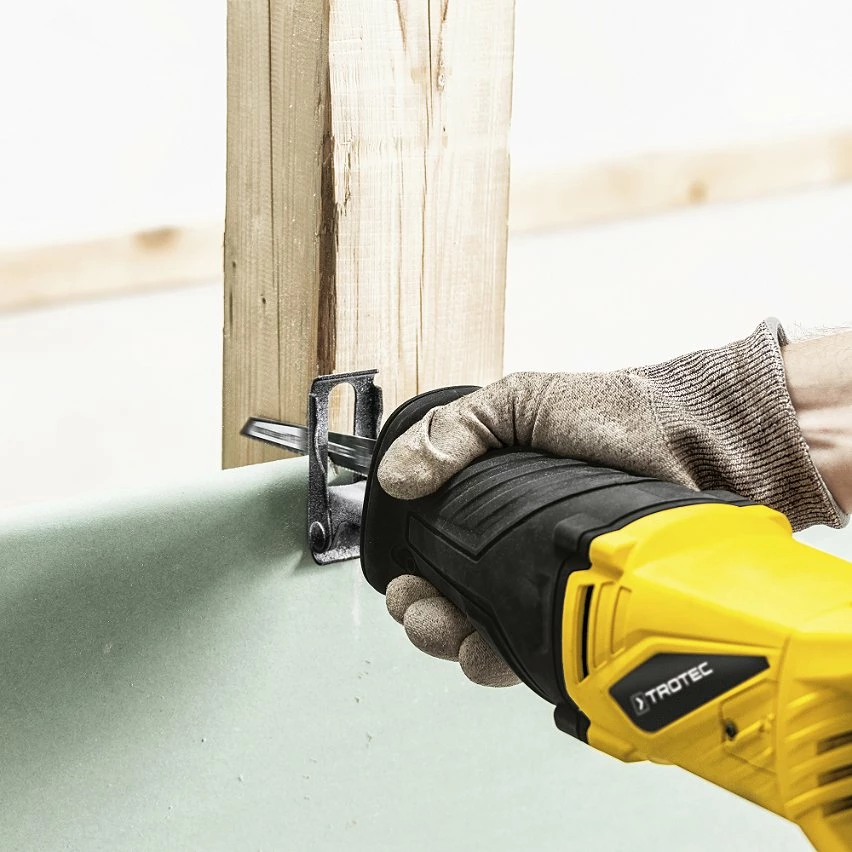 Les 850 watts de cette scie sabre pendulaire peuvent être régulés de façon intuitive en appuyant plus ou moins fort sur le bouton de mise en marche : une faible pression se traduira par une puissance réduite ; si vous appuyez à fond, l’appareil fonctionnera à pleine puissance. Cette scie est également dotée d’un limiteur de course permettant de régler la vitesse de course en fonction du matériau. Cet élément de commande est intégré sous forme de molette à l’interrupteur de mise en marche.