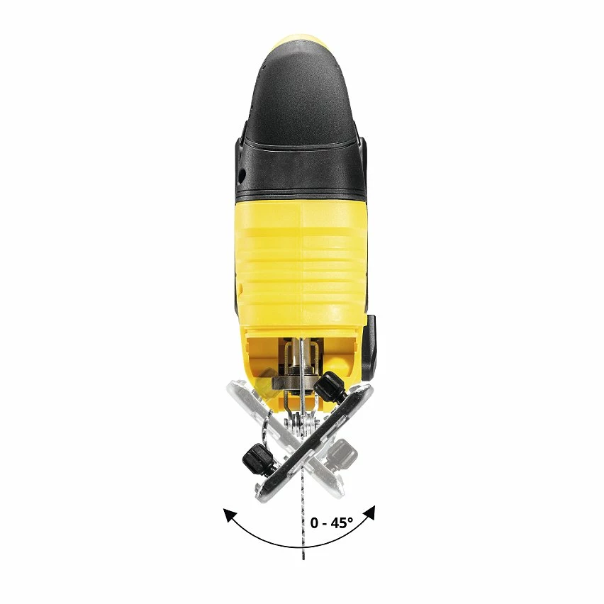 Pour profondeurs de coupe de 80 mm dans le bois, de 12 mm dans l’aluminium et de 5 mm dans le métal. Pour les coupes en biais, la semelle peut être inclinée des deux côtés jusqu’à 45° par pas de 15°.