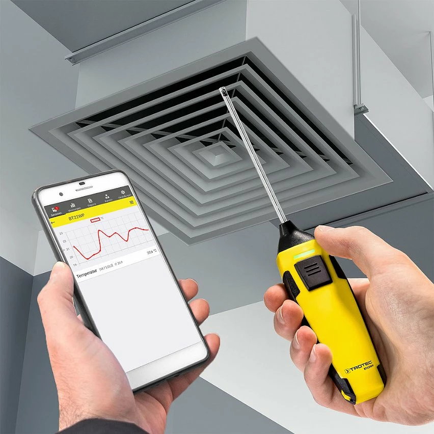 Sonde thermométrique connectée TROTEC BT22WP Mesure de la température, gestion via application et connexion à smartphone : Ce thermomètre numérique doté d’une sonde ultra-fine est parfait pour mesurer la température de gaz non agressifs dans des endroits difficilement accessibles, des conduits et gaines d’aération et de ventilation, ainsi que pour contrôler la température de liquides non agressifs.
